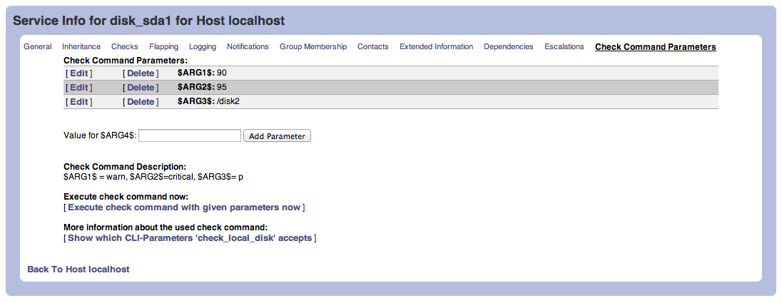 Example: Assuming you need to change the partition name ($ARG3$ - see below) for a service using "check_disk" (nagios-plugins) as check. You can now change the name, which is provided as parameter.